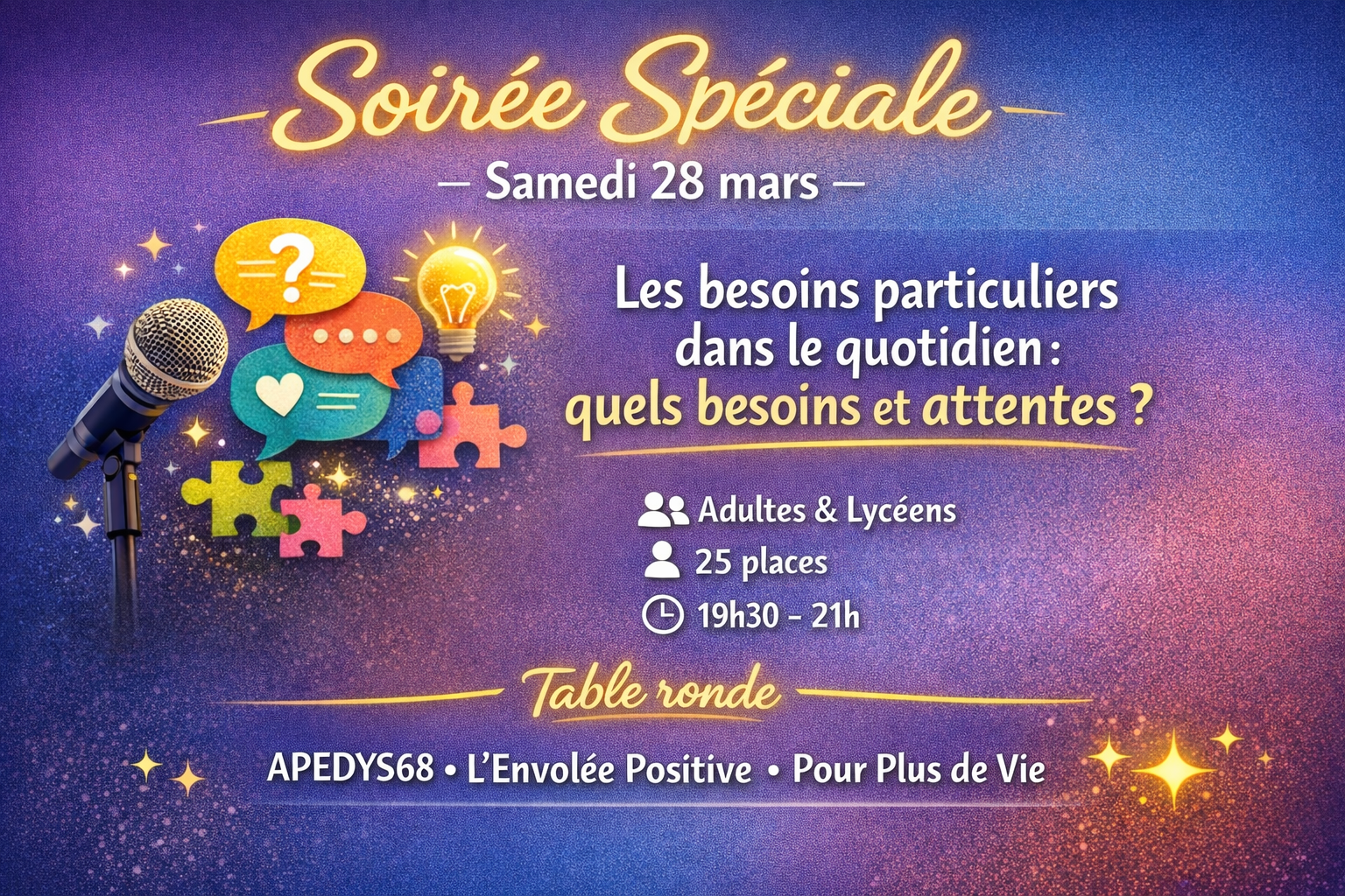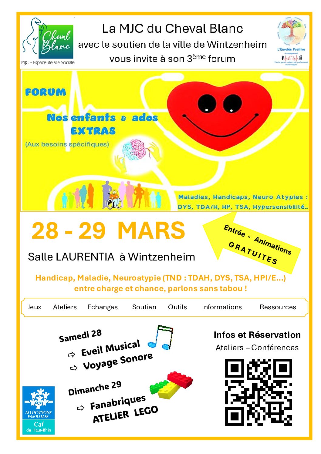 Durant deux journées, parents, professionnels et associations locales se réunissent pour informer, soutenir et partager autour des DYS, TDAH, TSA, hypersensibilité et des enjeux de la parentalité.